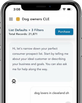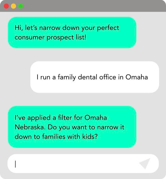Try our simple chat format to find the exact, targeted consumer prospect or lead list you need to grow your business.